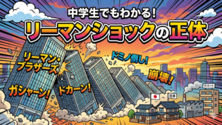 リーマンショックとは何だったのか?アメリカの銀行破綻がなぜ日本の派遣切り・内定取り消し・景気悪化につながったのかを、中学生にもわかるようにやさしく解説します。