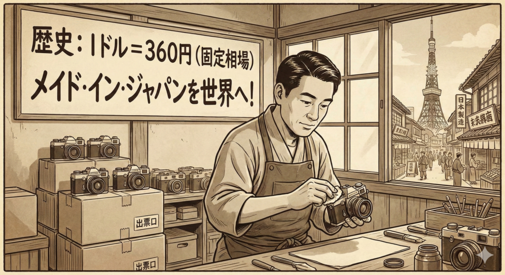 当時の日本は、戦争から復興しようと頑張っている途中で、まだ貧しい国だった。 だから、「1ドル360円」という超・円安のルールを逆手にとって、**「日本の製品は性能が良いのに、世界一安いぞ!」**とアピールしまくったんだ。