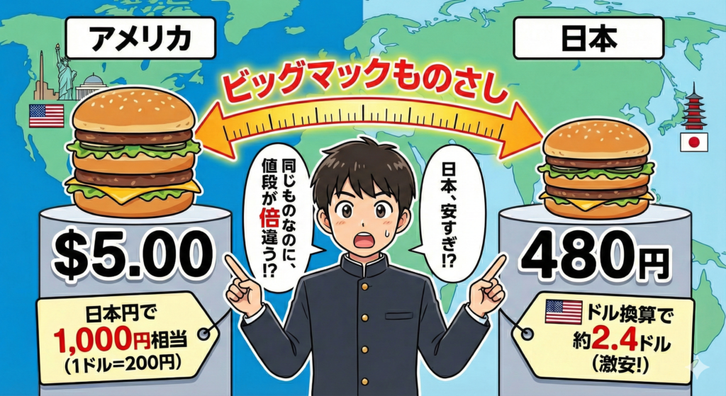 ここで、ちょっと面白い「世界共通のものさし」を紹介しよう。その名も**「ビッグマック指数」**! 世界中どこでも同じ品質で売られているビッグマックの値段を比べることで、「その国のお金の実力」が丸裸になっちゃう便利な道具なんだ。