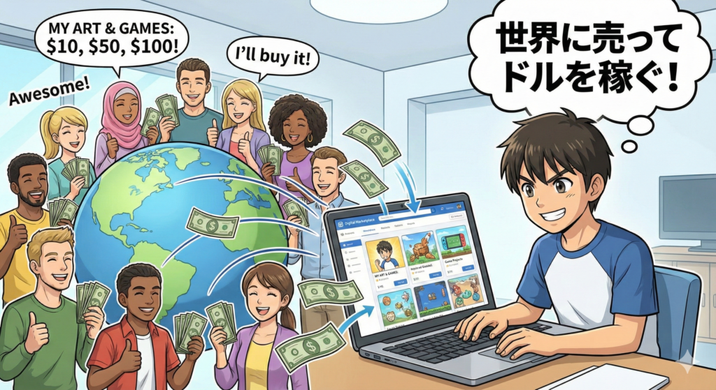 - ゲーム制作: 自分で作ったゲームを世界向けに配信すれば、世界中のプレイヤーがドルで課金してくれる。