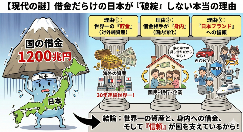 - 「技術と信用」という看板がある: トヨタやソニーといった世界的な会社があり、真面目に働く国民がいる。この「日本というチームなら、いつかちゃんと返せるだろう」というブランド力が、1200兆円という数字を支えているんです。