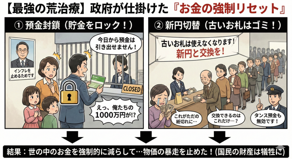 - ステップ2: 手持ちの現金も交換制限で減らされる(新円切替)。