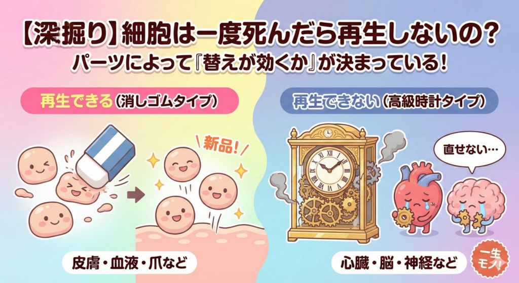 私たちの体は、場所によって**「使い捨てOK」なパーツと、「一生モノ」**のパーツに分かれています。