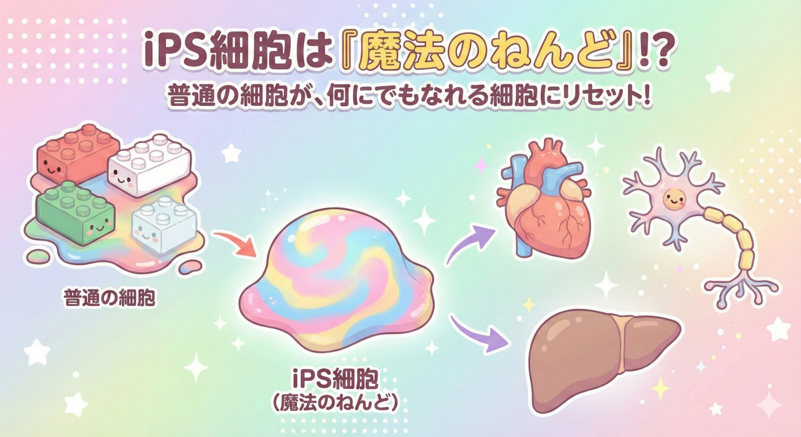 - iPS細胞(可能性無限大の赤ちゃん): 「将来、お医者さんにもスポーツ選手にも何にでもなれるよ!」という、生まれたての赤ちゃんのような状態です。大人の細胞(皮膚など)を、魔法で**「赤ちゃんの状態」まで若返らせたもの**がiPS細胞です。