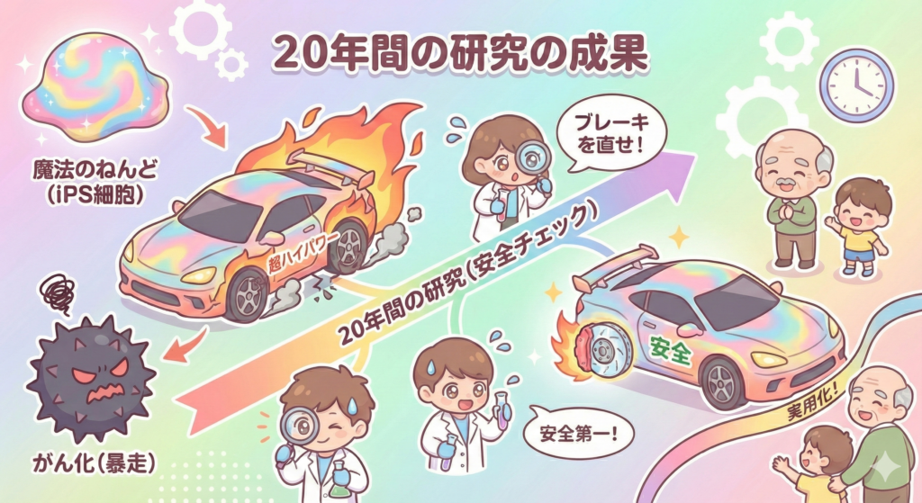 - 20年の努力: 「がん化(不良化)」を防ぐための安全チェックをやり遂げた。
