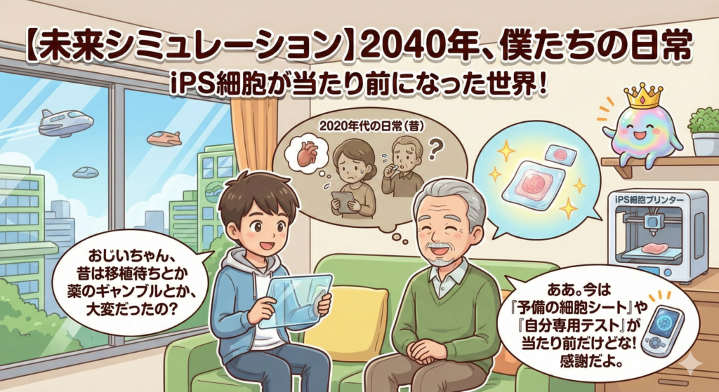 ある日の会話(2040年) 中学生: 「おじいちゃん、昔は心臓が病気になったら、他の人から移植してもらうのを何年も待ってたって本当?」 おじいちゃん: 「ああ、本当だよ。今は自分の細胞をちょっと取って、工場で『予備の筋肉シート』を作って貼ればすぐ治るけど、昔は大変だったんだ。」 中学生: 「へぇー! 薬を飲む前に、自分の細胞で『合うかどうか』チェックするのも当たり前じゃなかったの?」 おじいちゃん: 「そうだよ。昔は『飲んでみないと分からない』なんて、今思えばギャンブルみたいなことをしてたんだよ。」