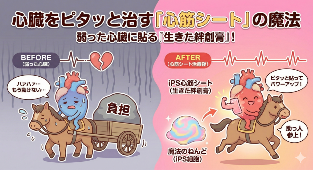 心臓が弱っている状態は、重い荷物を引いている馬がヘトヘトになっているようなものです。 そこに「iPS細胞で作った新しい筋肉のシート」を貼ると、そのシートが一緒にピクピク動いて、**心臓の動きを助ける「助っ人」**になってくれます。さらに、シートから出る特別な物質が、元々あった心臓の細胞を元気にしてくれる効果もあるんです。
