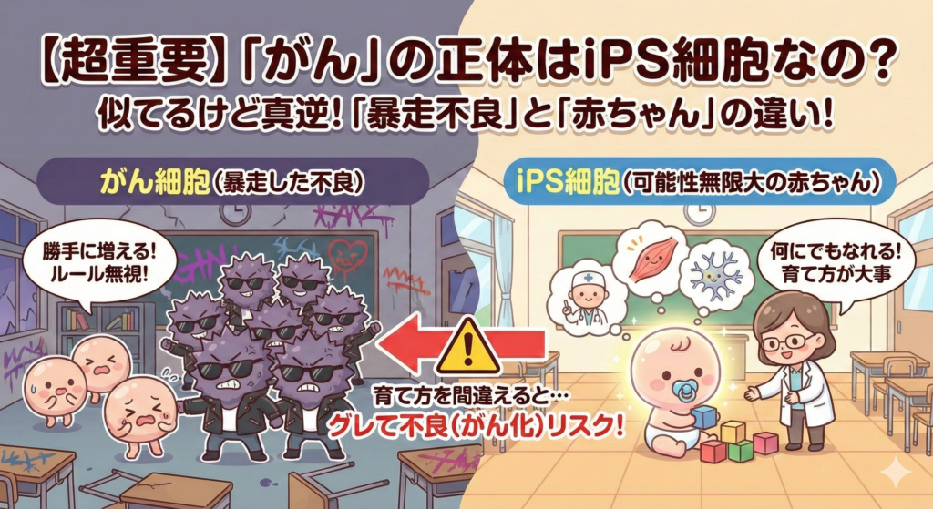 「がんも増えるし、iPSも増える。じゃあ同じもの?」……いいえ、実は**「似ているけど、真逆の存在」**なんです! ここを勘違いすると怖くなってしまうので、正しく理解しましょう。