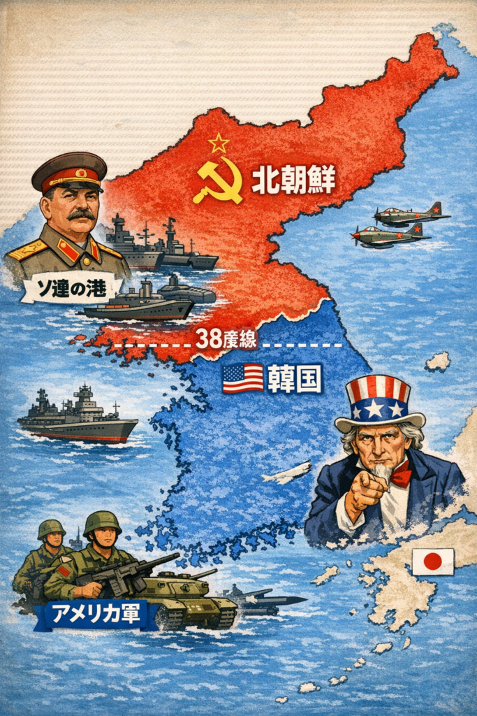 当時のロシアのリーダー、スターリンさんはこう考えました。 「朝鮮半島の北側を、俺たちの仲間にしよう。そうすれば、太平洋に出るための『自分たちの港』が手に入るし、ライバルのアメリカを足止めできるぞ!」