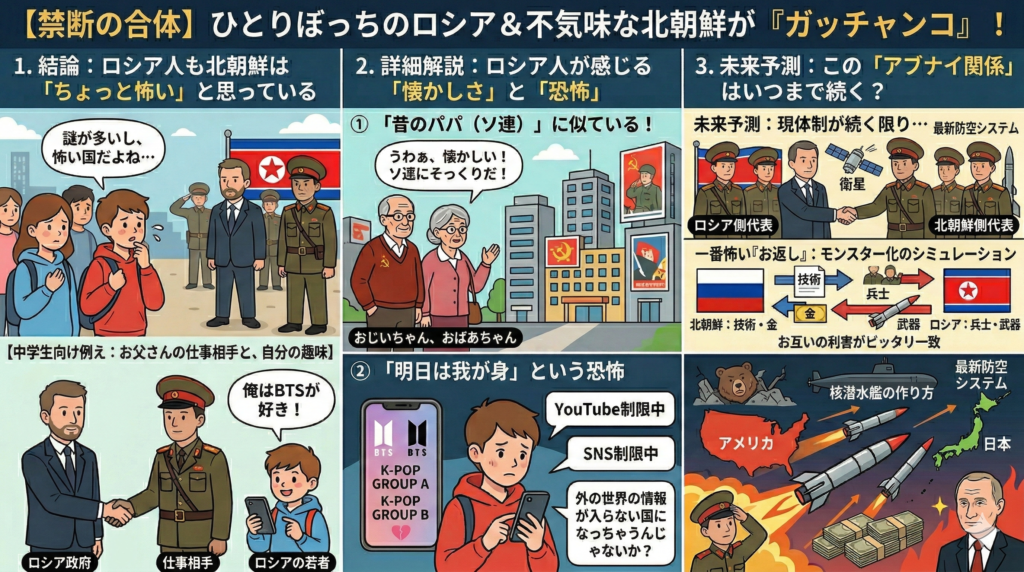 「ロシアと北朝鮮がこんなに仲良しなら、ロシアの人もみんな北朝鮮が好きなの?」 「これから先、この2つの国はずっと暴走し続けるの?」