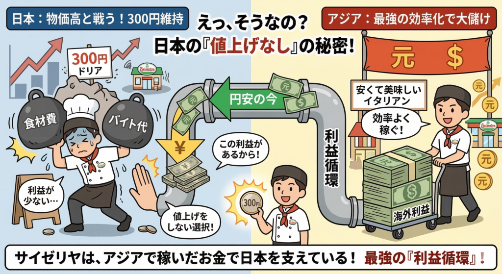 サイゼリヤは、この日本とアジアの二軸を持つことで、最強の**「利益循環」**を作っています。