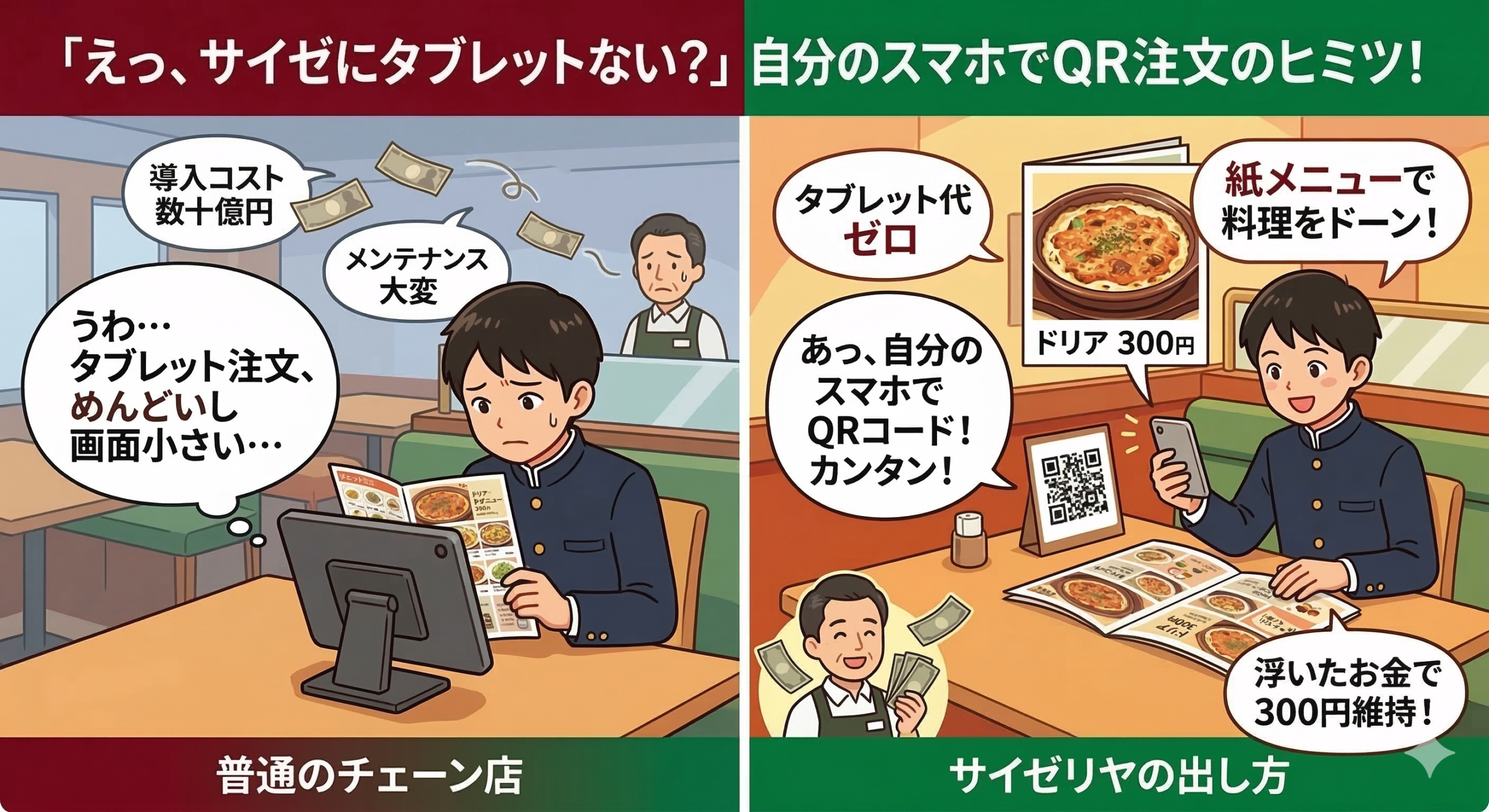 タブレット導入コストを削った分、ドリア300円の維持に回せます。 「自分のスマホを使う手間」を少しだけお客さんにお願いすることで、最強のコスパを届ける。これがサイゼリヤ流の、大人な「おもてなし」なのです。