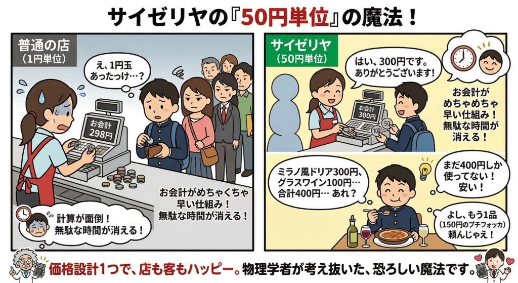 「ミラノ風ドリア300円、グラスワイン100円」 サイゼリヤのメニューは、基本的に**「50円単位」**で設定されています(300円、450円など)。