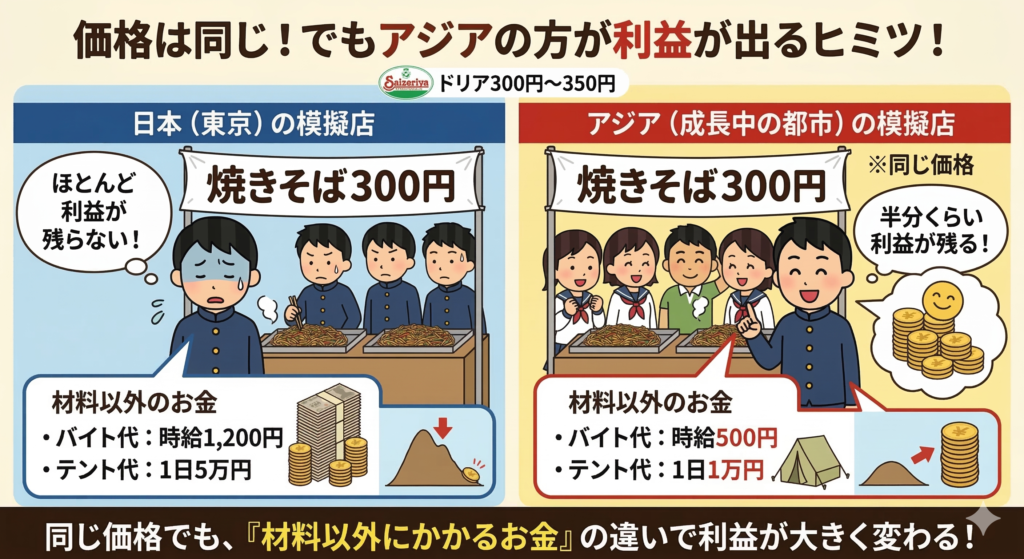 これが、利益率の差の正体です。 サイゼリヤは、日本で磨き上げた「0.1秒を削る超効率化(第1章でやりましたね!)」をそのまま海外に持っていきました。**「日本の超効率」+「海外の安いコスト」**が組み合わさった結果、アジアでは高い利益率を実現しています。