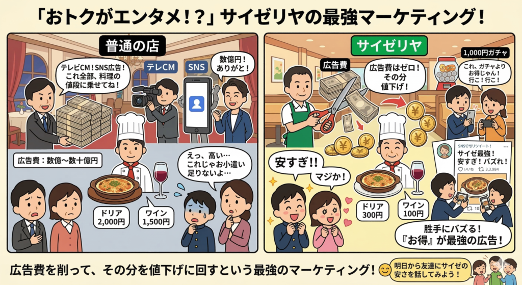 サイゼリヤは、こう考えました。 「300円のドリア、100円のワインという事実こそが、最強の広告だ!」