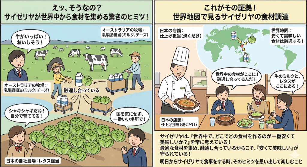 サイゼリヤは、「ここは日本だから」「ここは中国だから」と国ごとに区切って考えるのではなく、**「世界中で、どこでどの食材を作るのが一番安くて美味しいか?」**を常に考えています。