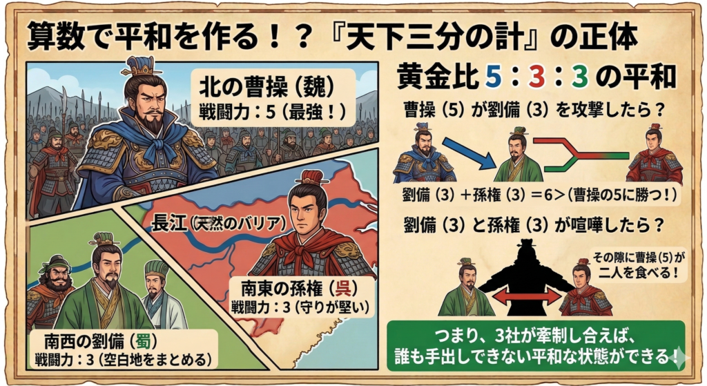 こうなるとどうなるか? 最強の曹操(5)が、劉備(3)を倒そうとすると、劉備と孫権がタッグを組んで「6」になり、曹操に勝てます。逆に劉備と孫権が喧嘩を始めると、その隙に曹操に食べられてしまうことになり戦争ができません。 つまり、**「3つのグループが絶妙に牽制し合うことで、大きな戦争が起きない安定した状態」**をわざと作る。これが「天下三分の計」の正体です。