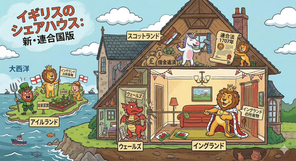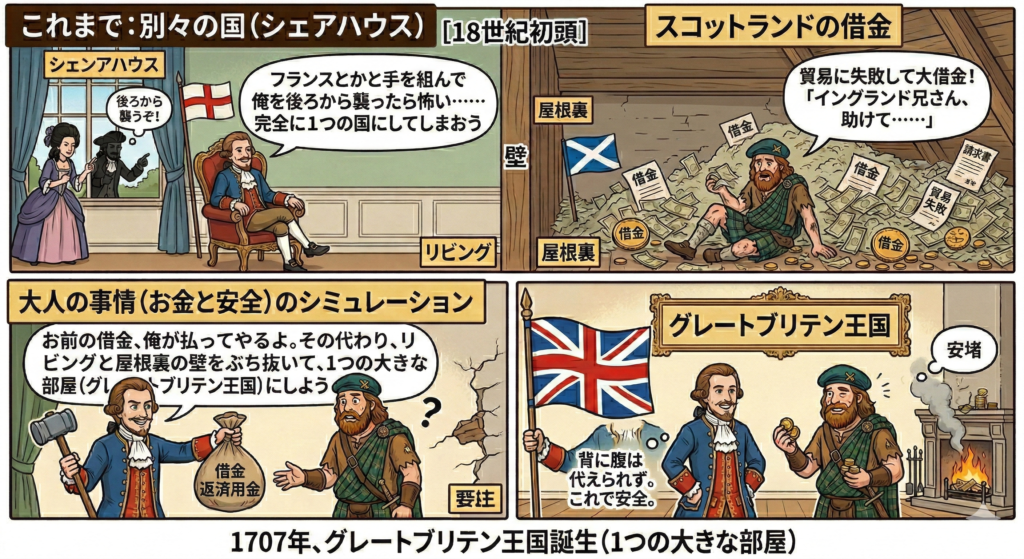 イングランドが、借金まみれのスコットランドに**「お前の借金、俺が払ってやるよ。その代わり、リビングと屋根裏の壁をぶち抜いて、1つの大きな部屋(グレートブリテン王国)にしよう」**と持ちかけたのです。