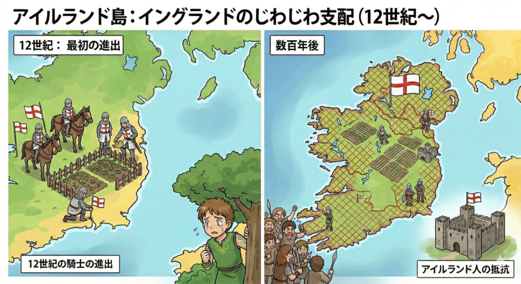 12世紀ごろから、イングランドの騎士たちがアイルランド島に渡り、**「あ、ここ空いてるね。俺の家庭菜園にするわ」**と、勝手に土地を占領し始めました。