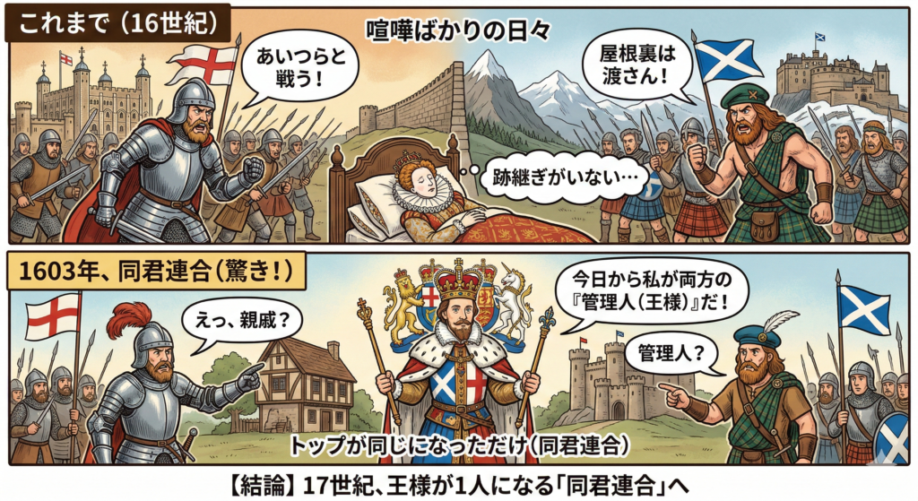 これは、シェアハウスのリーダー(イングランド)と屋根裏の住人(スコットランド)が、**「国は別々だけど、同じ『管理人(王様)』を雇うことにした」**状態です。