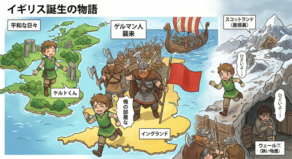 ところが、海を越えてマッチョな集団**「ゲルマン人(アングロ・サクソン人)」**がやってきます。彼らは挨拶もそこそこに、土足で島に上がり込んできました。
