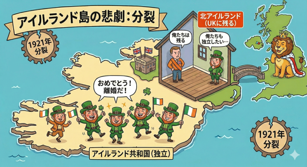 結局、お隣の家(アイルランド)の2階(北アイルランド)だけはイングランド兄さんの管理下に残り、1階(アイルランド共和国)だけが独立した、という不思議な状態になりました。これが今の「北アイルランド」の正体です。
