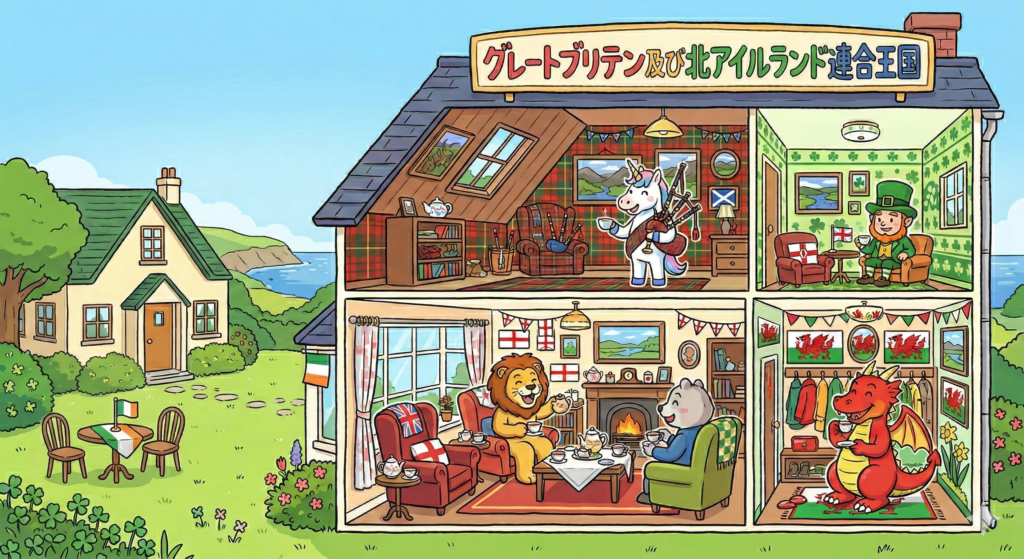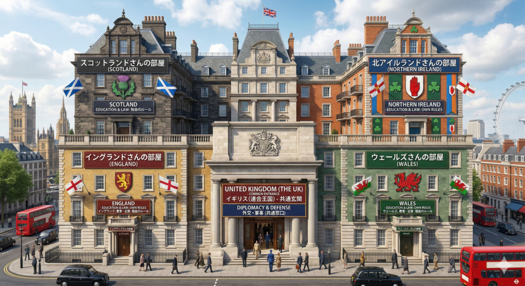 これを想像してみてください。 「イギリス」という名前の大きなマンションがあります。でも、中に入ると**「イングランドさんの部屋」「スコットランドさんの部屋」…と、完全に表札が分かれている**んです。