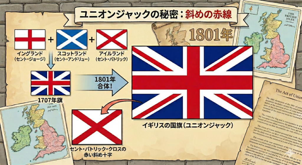 - イギリスの国旗「ユニオンジャック」の「斜めの赤線」に注目! これは、1801年に最後に合体した「アイルランド」の旗の模様です。